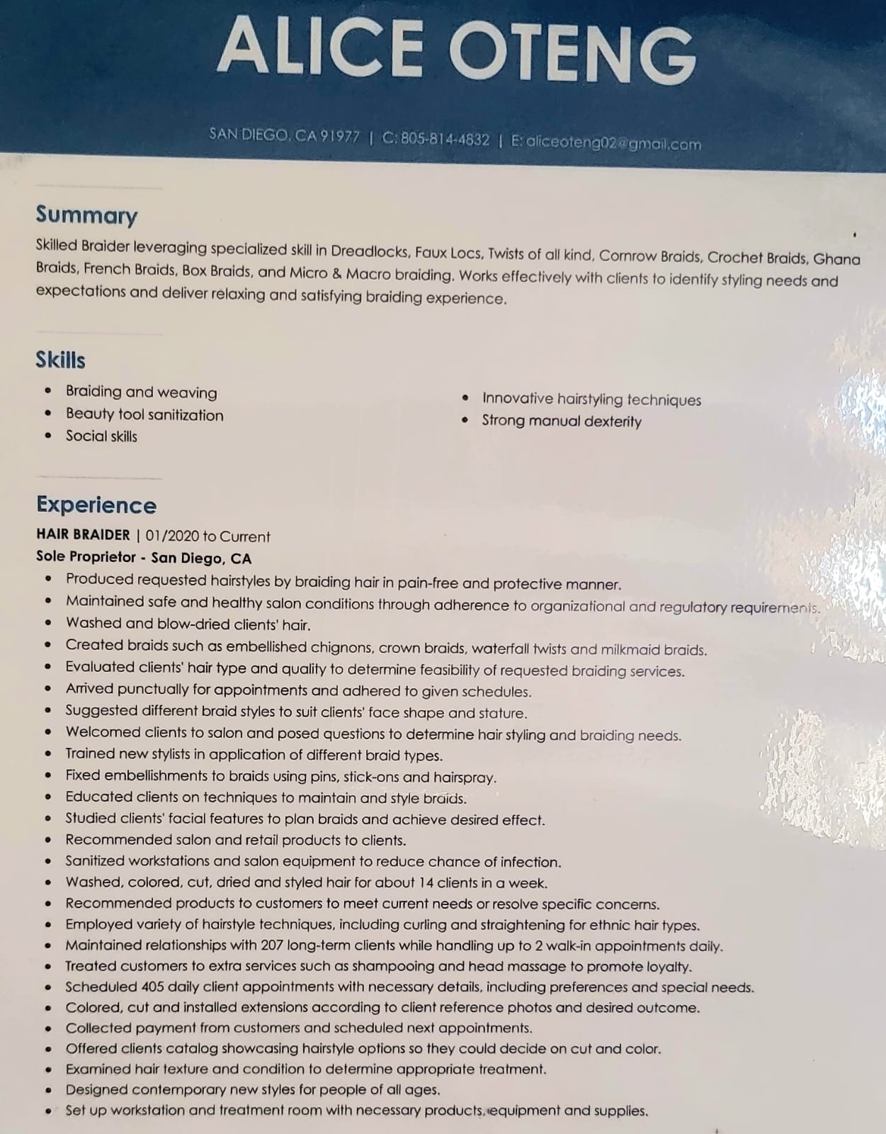 Completed a 3-year Hair Braiding Vocational School in Ghana. Since graduation, hair braiding has been my profession. When I moved from Ghana to California, I immediately established my braiding business. Through word-of-mouth advertising from my customers, I have attracted a lot of clients to my business since then.