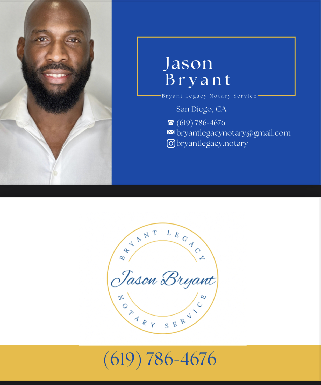 Hello Black San Diego. My name is Jason Bryant. I am a mobile Notary Public that serves San Diego County and beyond. If anyone needs my service, please feel free to reach out to me here on Facebook, or at 619-786-4676. I’m looking forward to hearing from you soon.